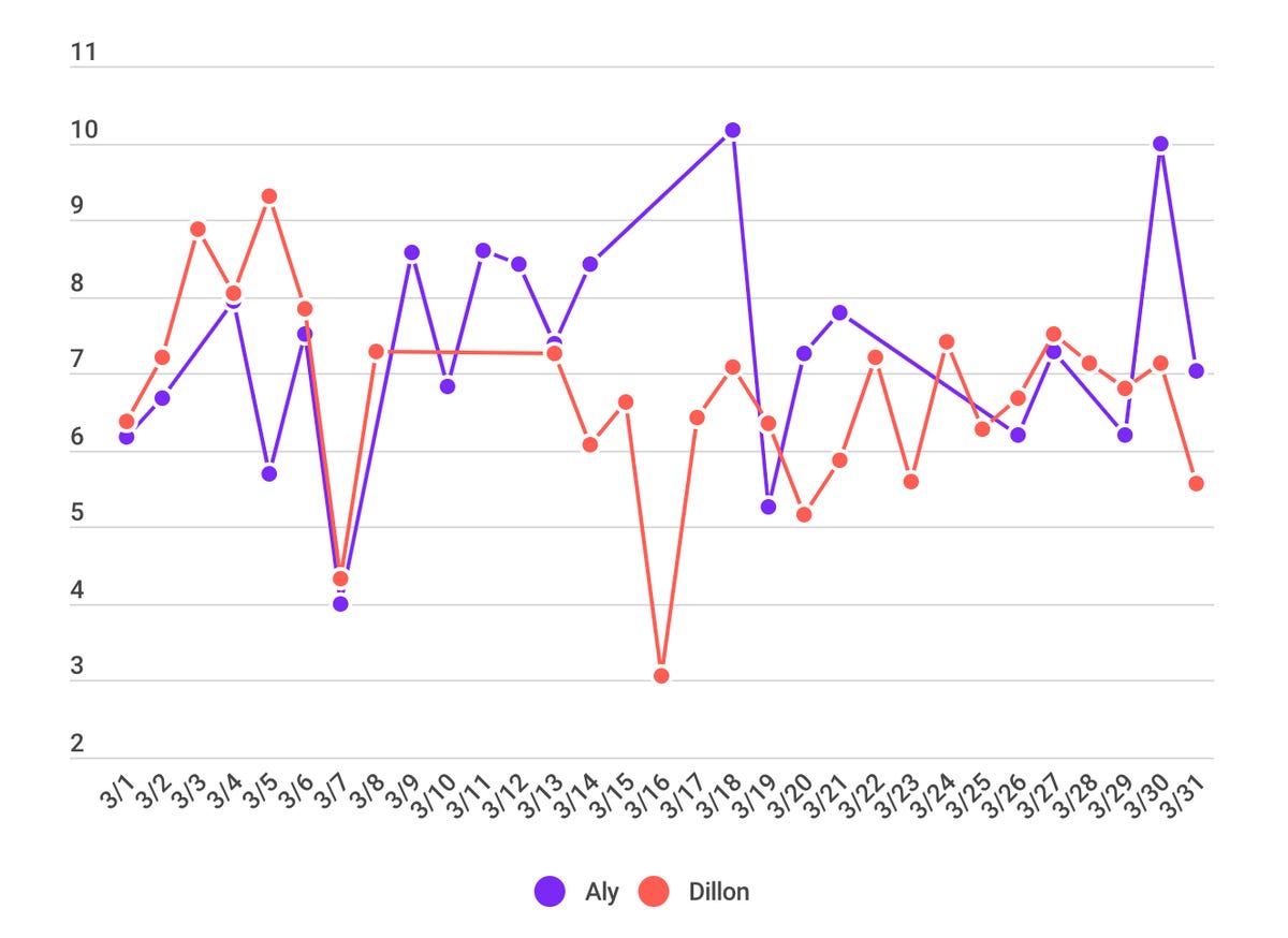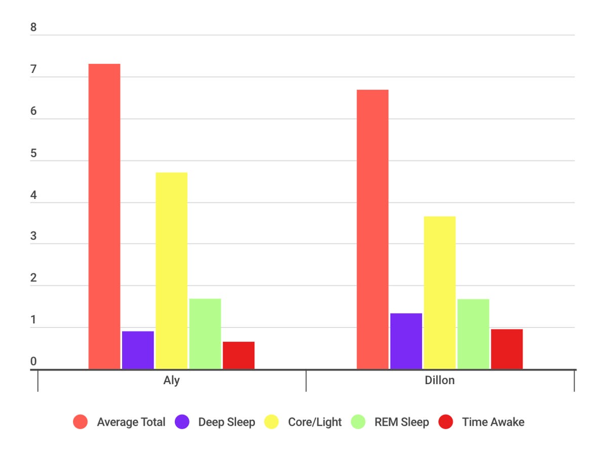 Let’s dive into the numbers. As you can see in the graph below, Dillon and I were all over the place. My nightly sleep ranged from a low of 4 hours to a high of 10 hours (which is exceptionally high for me), while Dillon’s ranged from 3 to just over 9 hours. As I mentioned, we missed a few nights of tracking due to the bedframe tracker disconnecting or my Apple Watch deciding not to track my sleep for reasons unknown.