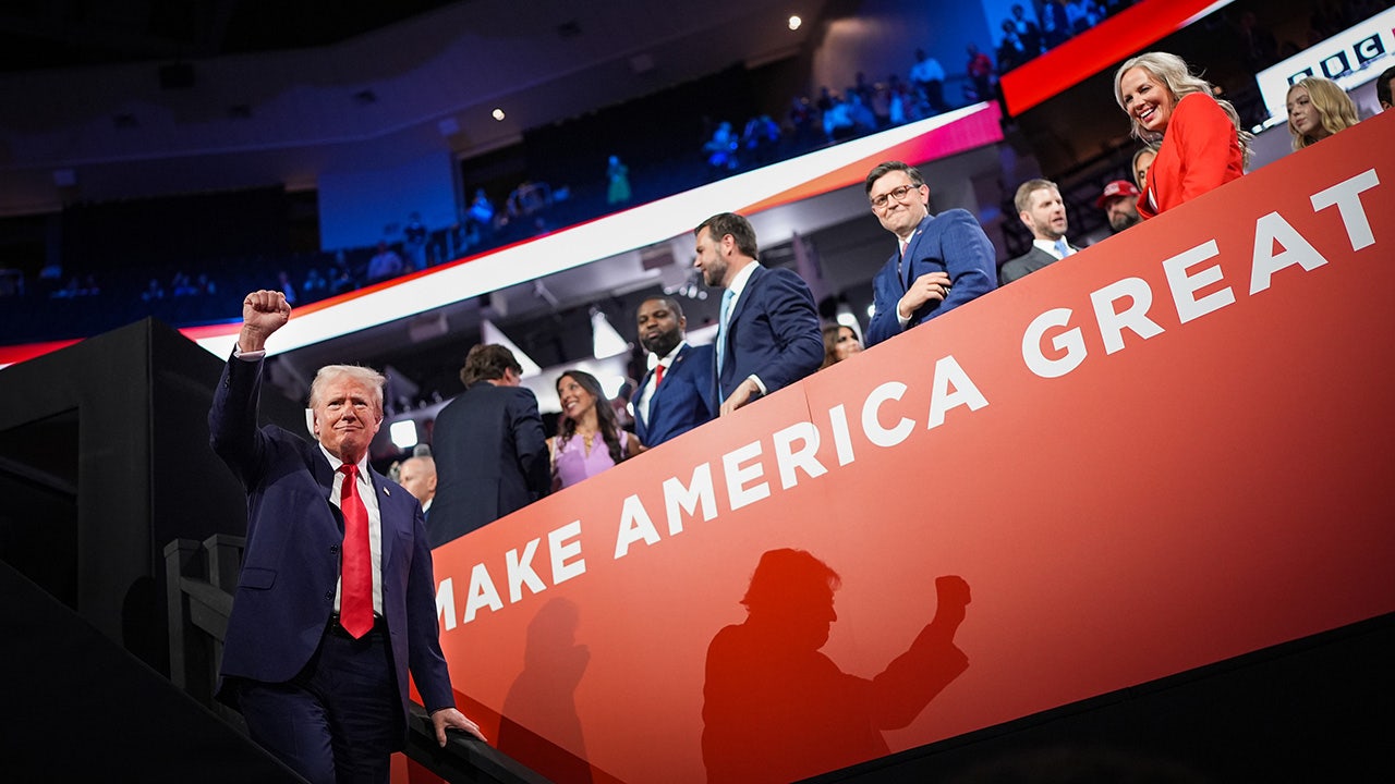 Republican presidential candidate former President Donald Trump and Republican vice presidential candidate Sen. JD Vance, R-Ohio sign paperwork to officially accept the nominations, as former first lady Melania Trump, Usha Chilukuri Vance and House Speaker Mike Johnson watch during the final day of the Republican National Convention at the Fiserv Forum in Milwaukee, Wisconsin on Thursday, July 18, 2024.Â