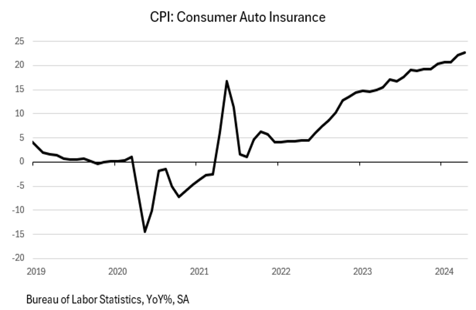 Then came Wednesday’s Consumer Price Index (CPI) release for April, and it showed up on the cooler side. Markets were prepped for a +0.4% month/month reading for the headline number, but it showed up as +0.3%, and to much celebration. (The year/year numbers were 3.4% for the headline (vs. 3.5% in March) and 3.6% for the core. Much of the rise in the CPI has been due to just a few areas, auto insurance being one of them (see chart). Health care services is another culprit.