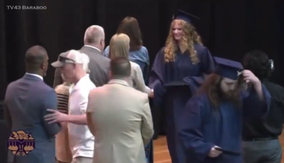 Graduation footage from last week shows the man, whose identity has not been reported to protect his daughter, coming onto the stage as his daughter shook school officials’ hands.