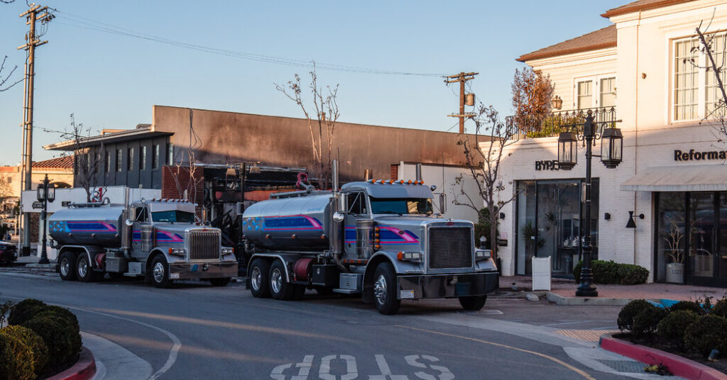 Private crews often ride in trucks that also carry a few hundred gallons of water, Mr. Wheelock said. Ms. Wiley said her teams, when working in remote locations, will draw water from nearby ponds and lakes. In more developed areas, Mr. Holter said, his teams have often drained residents’ swimming pools for water, and then turned to fire hydrants to replenish their supplies.